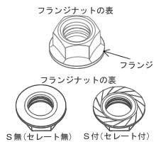 フランジナットとは、六角ナットにフランジが付いたネジです。 通常の六角ナットより座面が広いため接地面が広い分、摩擦が起きて緩み止めに効果があるとされています。 ワッシャーが不要な為、作業性が良く、見た目もスッキリとして陥没をしないことが利です。 ※S付とは、フランジの裏にセレートと呼ばれるギザギザした形状になっていることを指します。 座面に食い込む形状となっているため、セレート無(S無)と比較して緩み止めがさらに期待できるとされていますが、相手材をセレートで傷をつけてしまうという欠点もあります。 |
