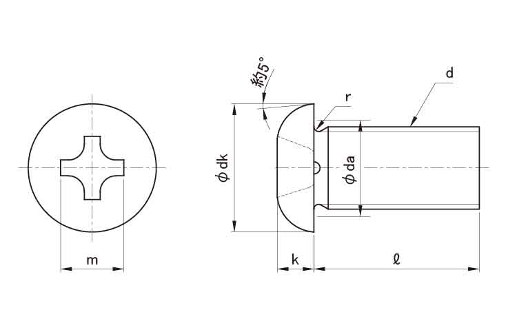 最も多く使われている、代表的な小ねじです。上面の角に丸みを持たせた形状をしています。頭に厚みがあるので、ドライバーとしっかりかみ合うことができ、強く締め付けることができます。"