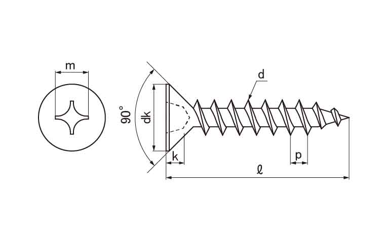 皿頭とは頭は上面が平らで座面が円錐形の形状。他のネジとは違い頭を含む全長が長さとなる。
