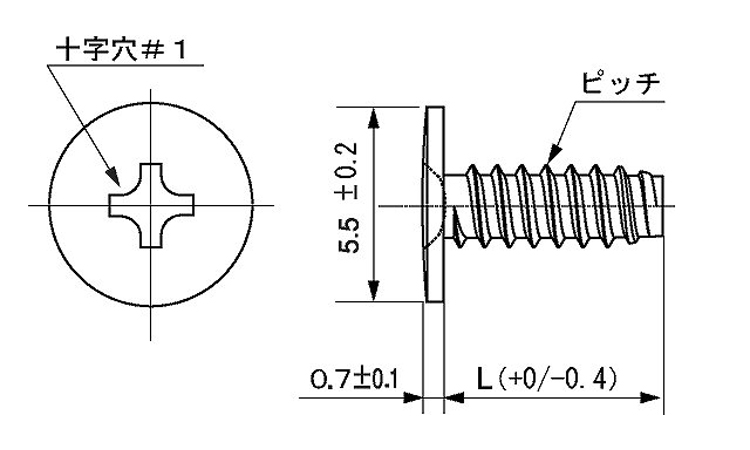 | Aタッピングよりもネジ山からネジ山の間隔が短く(ピッチが細かく)ねじ込みの作業性に優れている。先端2~2.5山がテーパー | |