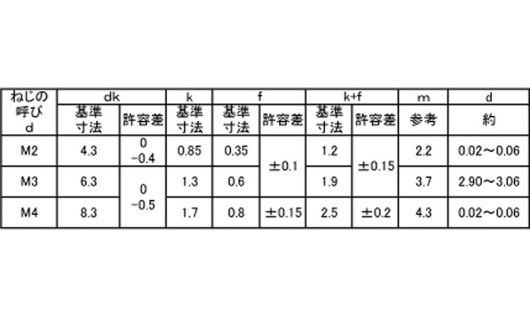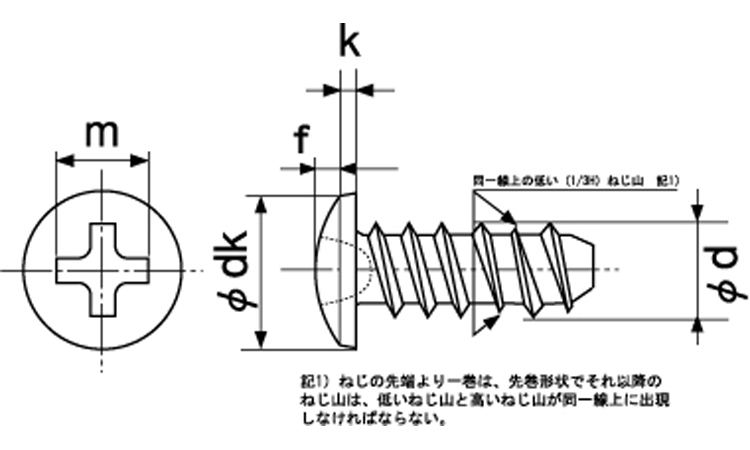 ねじ部の形状は、タッピンねじの2種タイプで、ねじのピッチは1種と同じに設計され、先端部から3山?3.5山の所まで高いねじ山と低いねじ山とでなっており、この間欠部分が合成樹脂に対して大きな特性を発揮します。
