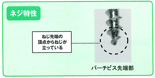・先端まで立ったネジ山が、相手材を確実にとらえ堅い表層部を壊さず食い込んでいきます。