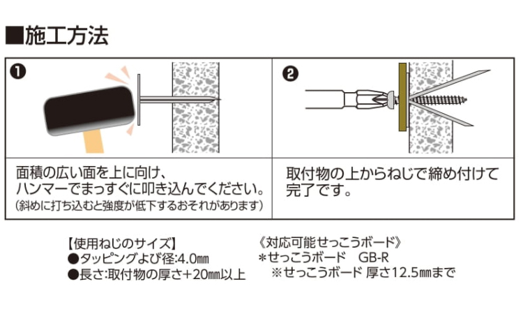 ◆耐荷重:最大引抜強度石膏ボード12.5mm28kgf