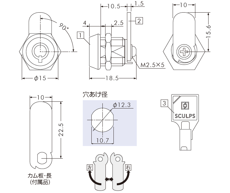 カム板を裏返すことで鍵の開閉方向を左右に変更することができます。