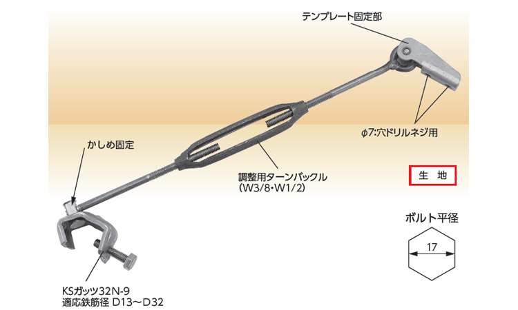 ●鉄筋にKSガッツをボルト留めし、テンプレート側をドリルネジで固定するだけの簡単施工。
