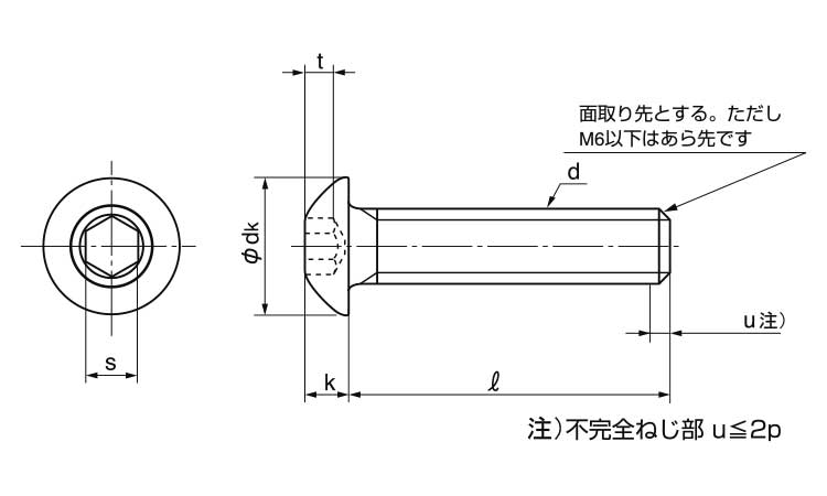 同じサイズの六角穴付きボルトと比べると、六角穴の大きさが小さくなっています。
