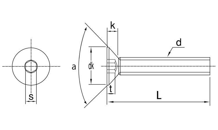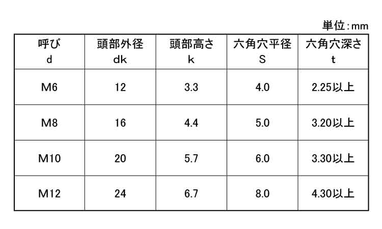 また、六角穴付きボタンボルトと同じく、六角穴の大きさが六角穴付きボルトより小さめです。皿キャップとも呼ばれます。