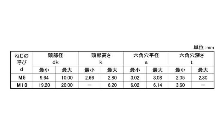 また、六角穴付きボタンボルトと同じく、六角穴の大きさが六角穴付きボルトより小さめです。皿キャップとも呼ばれます。