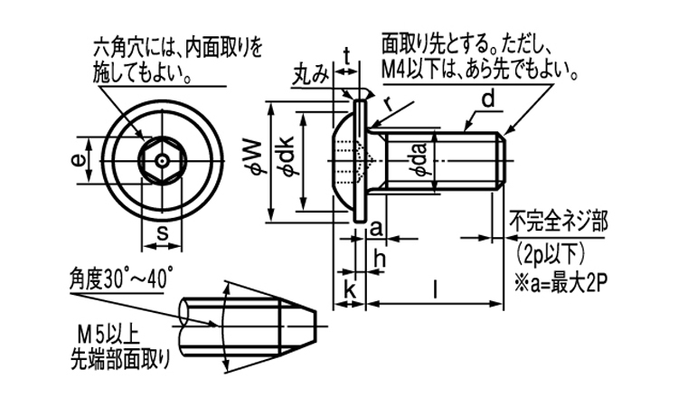 同じサイズの六角穴付きボルトと比べると、六角穴の大きさが小さくなっています。