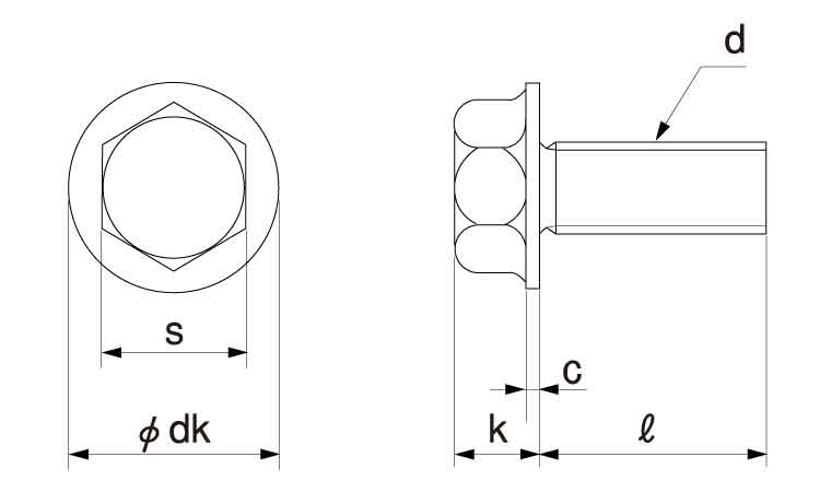 頭にフランジ(円錐形のつば)をつけた六角ボルトです。座面の面積を大きくすることで、緩み止めの効果や、締結する材料に座面が陥没することを防ぐ効果があります。