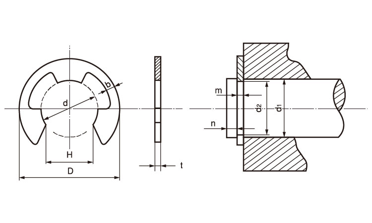 E形止め輪(Eリング)は、形状がアルファベットの”E”に似ていることから呼ばれています。