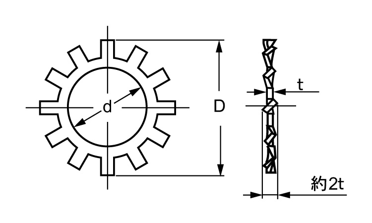 4.内外歯形--歯の数が内、外にあり、ゆるみどめ効果をさらに増大させた歯付座金です。