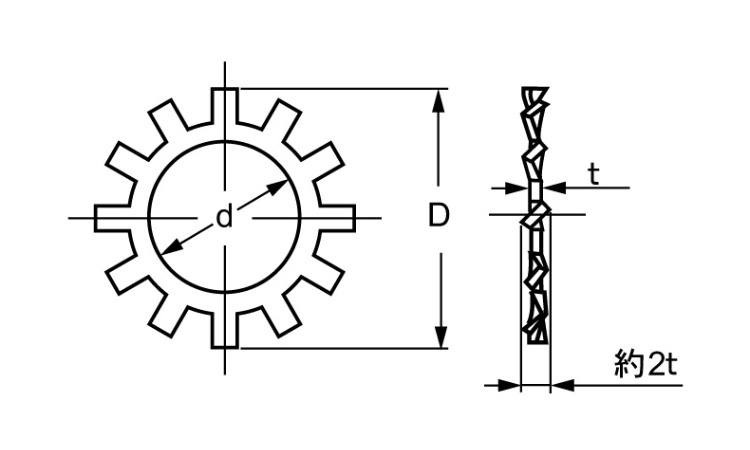 4.内外歯形--歯の数が内、外にあり、ゆるみどめ効果をさらに増大させた歯付座金です。