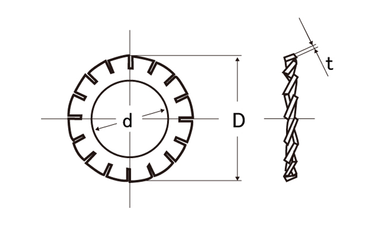 2.外歯形----外径側の歯を45度ほど絞り、ばね作用を利用してネジのゆるみを防止します。