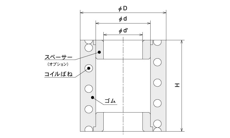 ゴムとコイルばねを組合わせた円筒形の複合ばねの構造により柔かいばねが得られ、たわみが大きく取れます。