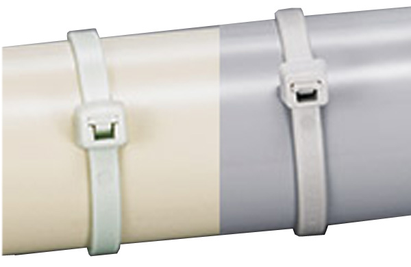 ●従来の一般的な66ナイロン製耐候グレードの結束バンドは、紫外線しゃ蔽剤カーボンブラックを添加しているため黒色ですが、「ABシリーズ 耐候性カラータイ」は、白い外壁やエアコンホースの色に馴染みやすい、明るい色調の結束バンドです。