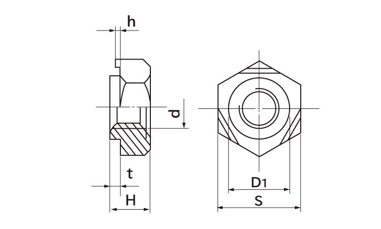 ●パイロット(ナットの底部にあるリング状の座)付きとなり、相手材の下穴との位置決めの役割を果たします。