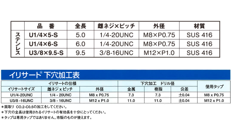 2)イリサートはプラスチック・樹脂類・軽金属・鉄板等のネジ穴強化や修理等に使用できます。