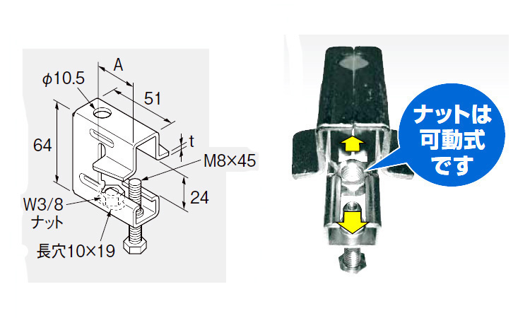 ・本製品は形鋼から吊りボルトを下げる金具です。