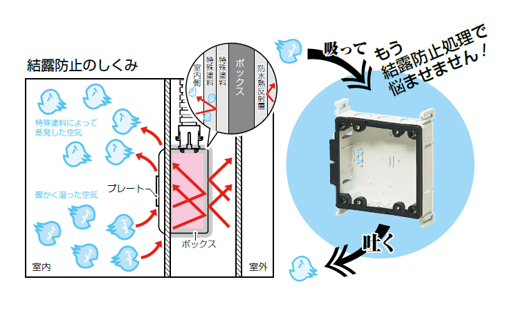 ●施工性は従来のボックスと全く同じ。特殊塗料はボックス内側に塗布してあり、外側は従来通りなので付属品等がそのまま取り付けられます。