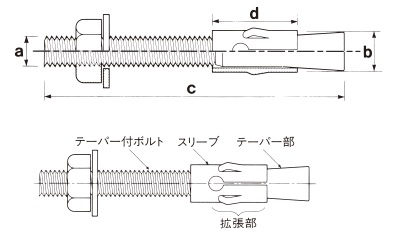 ![]() | ●孔内へアンカーを挿入 | ●スリーブのセット方法が適切であるかを確認すること。 ●テーパー月のボルトを挿入する際は、 テーパー部の先端が孔底に着くまで入れること。 |