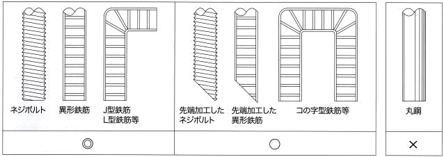 使用するアンカー筋は全ねじボルト、異形鉄筋で、埋込側先端を斜め45°カットしたものを使用して下さい。