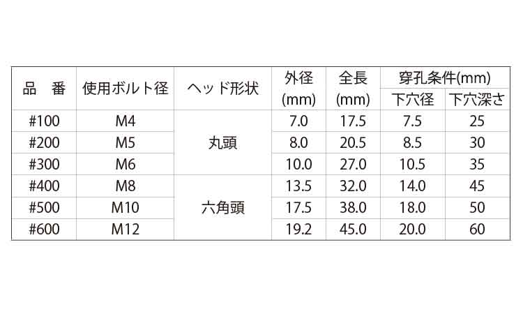 ●下穴あけは指定サイズのドリルを必ず使用してください。(適性強度を得るため)