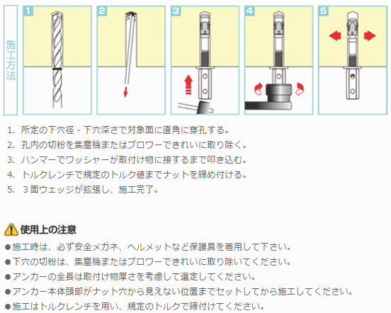 ・トルク管理による施工と大きな3面ウェッジで、懸垂物取付けに確実な強度を発揮。