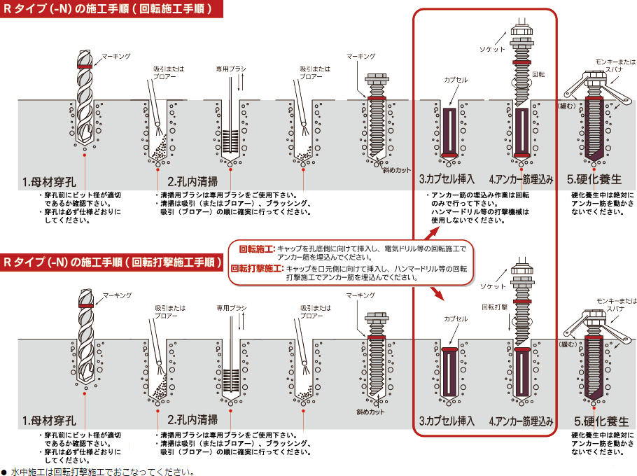 アンカー筋の埋め込み機械を従来のハンマードリル(回転打撃施工)から電気ドリル(回転施工)にしたことで 、早く楽に施工ができます。