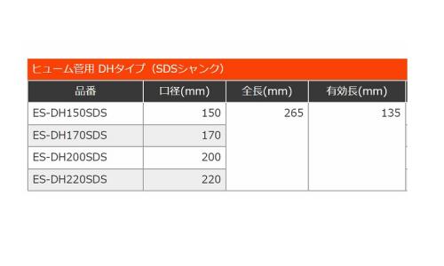 単機能コアドリル E&S(乾式ダイヤ用)ヒューム菅用 DHタイプ(SDSシャンク)