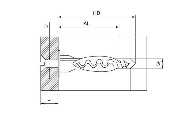 ● ネジ自体がアンカー内部にネジ切りを行います。ネジやまの幅に関係なくタッピングネジも、木ネジも使用できます。