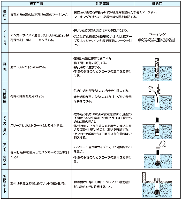 ボルト、外筒ともに鋼製で締め付け強度は絶大。耐震性も抜群で安全な施工ができます。ミニスリーブアンカーは、あらゆる作業がスピーディで、安全・確実に施工できるよう開発した画期的な埋込みアンカーです。