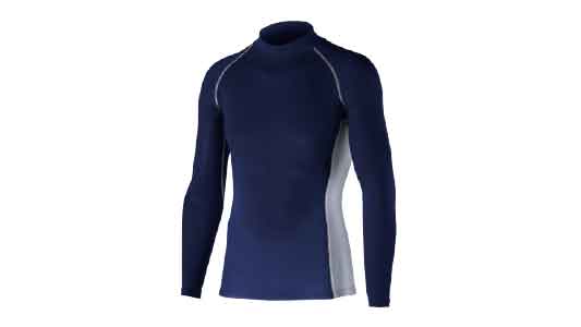 ●首周りの前方は動きやすいクールネックタイプのままに、厚さや紫外線によるダメージお受けやすい後方の襟足部分をハイネックタイプになるように縫製。