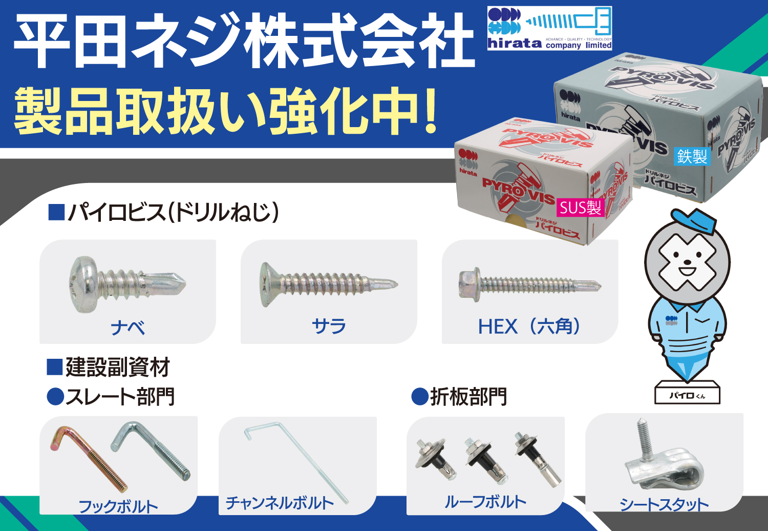「パイロビス」とは、平田ネジ株式会社が製造・販売するドリルねじ(ドリルビス)のブランド名です。 ねじの先端がドリルの刃の形状になっており、鉄骨系の下地材に対して下穴なしで「穴あけ・ねじ立て・締結」を一度に行えるのが最大の特徴です。
